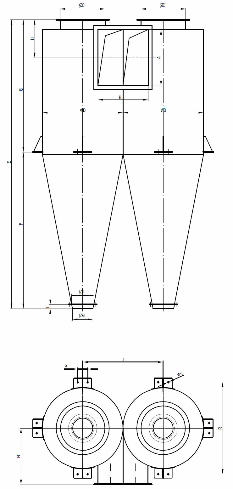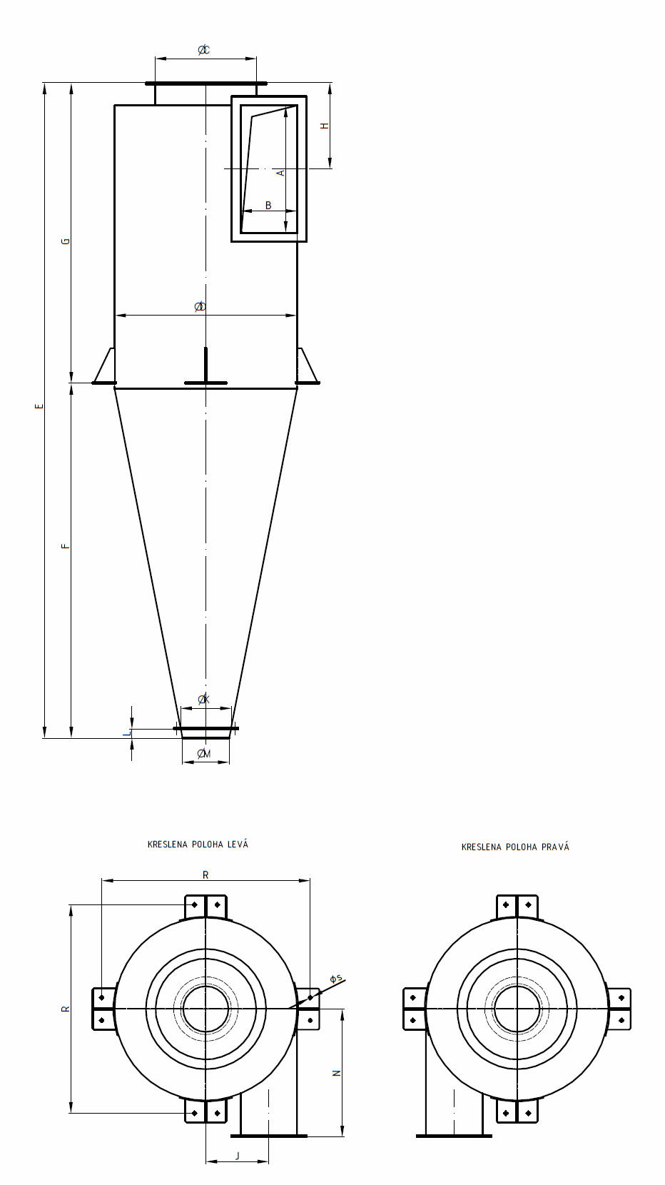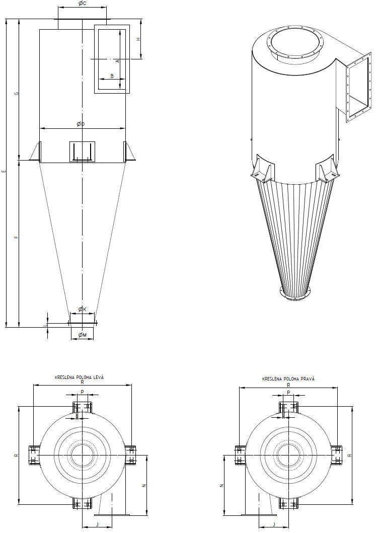 • Odlučovače jsou určeny především pro podtlakový vzduchotechnický systém, použitelnost pro přetlakový systém se nevylučuje. Konstrukčně jsou řešeny pro rozdíl tlaku proti atmosféře do hodnot ±8kPa. Odlučovač VPC je ocelové konstrukce. Jsou vyráběny o jmenovitém průměru 630, 800, 1000, 1250 ,1600 mm. Podle polohy vstupního hrdla do odlučovače se vyrábí odlučovač pravý a levý. Odlučovače VPC jsou s patkami. Přívod vzdušiny vstupním hrdlem do odlučovacího článku je tečný. Po odloučení příměsí v odstředivé komoře vystupuje vyčištěná vzdušina výstupní trubkou buď do sběrného potrubí, nebo do atmosféry. Odloučené příměsi padají do výsypky nebo jsou odváděny jiným zařízením dle projektu. Vhodné umístění odlučovačů, dodávané kompletující prvky, jejich kotvení, jakož i ostatní navazující vzduchotechnická zařízení určuje projektant odlučovacího zařízení podle provozních podmínek a místní dispozice.