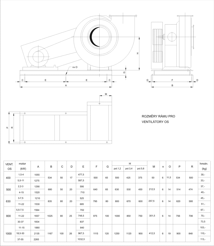 4. Ventilátory OS jednostranně sací podle normy PS 12 3237 jsou radiální středotlaké ventilátory transportní, které se vyrábějí ve velikostech 400, 500, 630, 800 a 1000. Jsou poháněny elektromotory přes řemenový převod, oběžné kolo je nasazeno letmo na hřídeli. Pro rozšíření výkonu ventilátorů lze zvolit různé převody s různými příkony motorů. Ventilátory se dodávají buď s volným koncem hřídele (bez převodu a elektromotoru) nebo s převodem (úplný řemenový převod a motor). Ventilátor s převodem je možno objednat na společném rámu.
