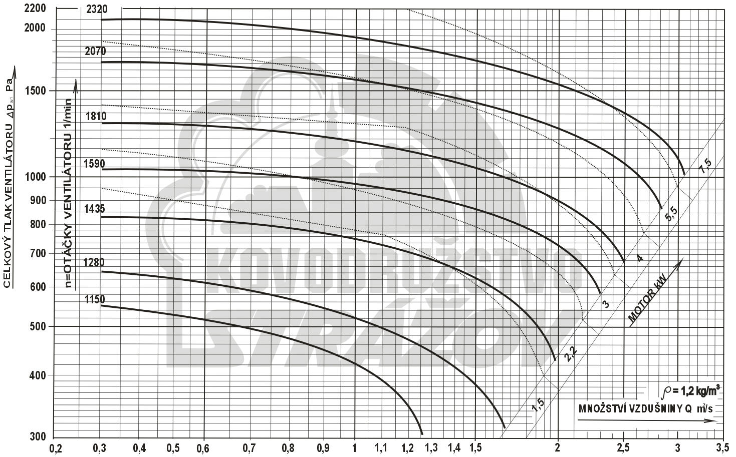 Výkonové oblasti ventilátoru RSS 500 na přímo - motor 2,2 kW, otáčky 1420 1/min