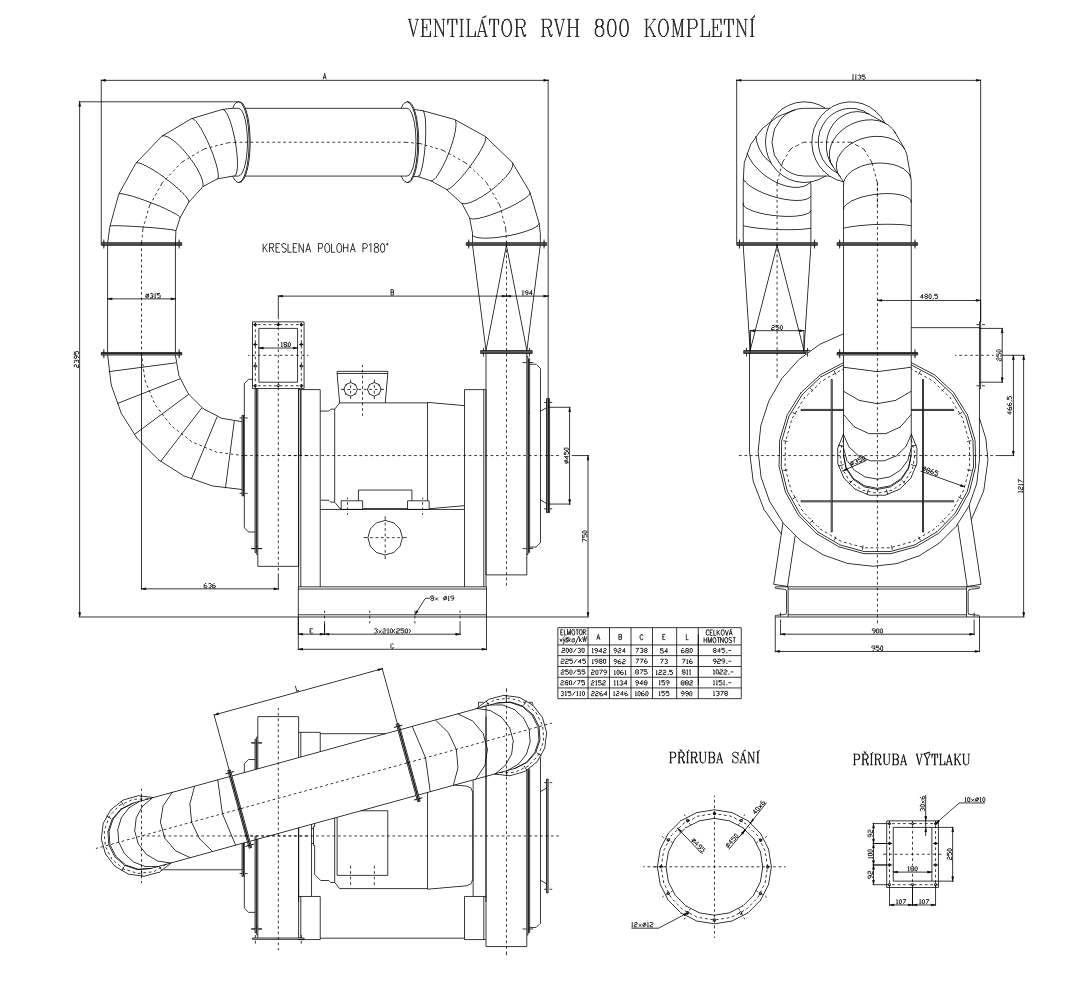 Ventilátor RVH 800 je dvoustupňový radiální vysokotlaký ventilátor, poháněný přímo elektromotorem s vyvedenými oběma čepy. Vzdušina je z prvního do druhého stupně ventilátoru přiváděna převáděcím potrubím.